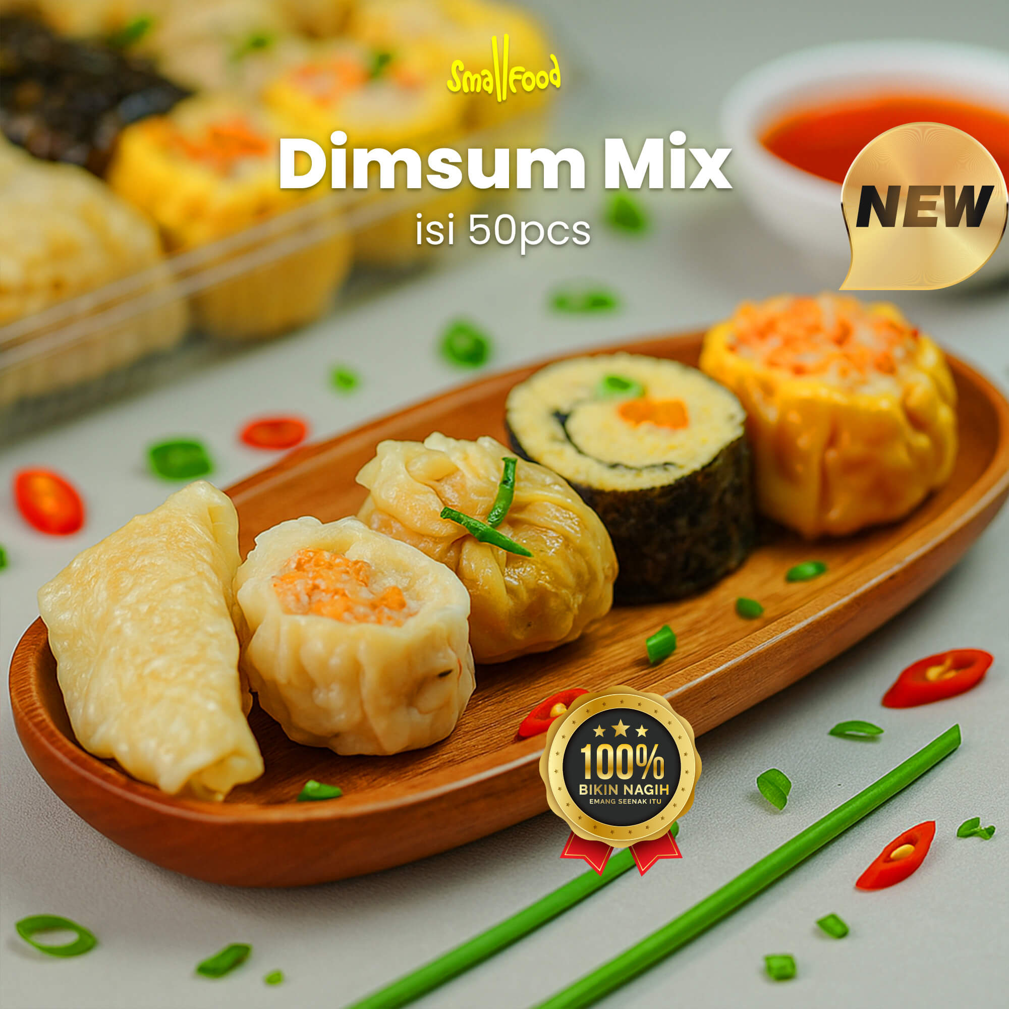 Dimsum Mix Smallfood berisi 50 pcs dimsum ayam premium dengan rasa dan tampilan berbeda yang siap manjain lidah kamu di setiap gigitan.